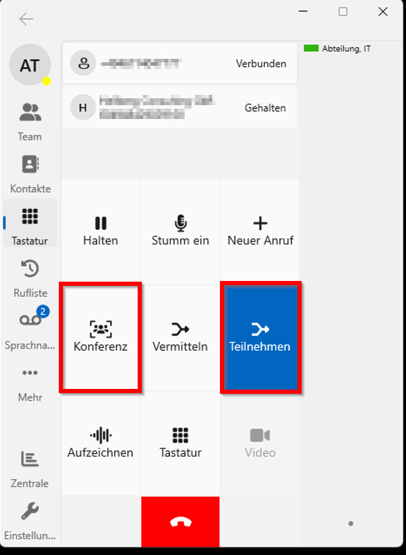 Es gibt auch die Möglichkeit eine Konferenz zu starten, in dem man auf "Konferenz" klickt. Dann holt man quasi nur den Anrufer dazu und telefoniert dann mit Weiterleitungsziel und Anrufer.